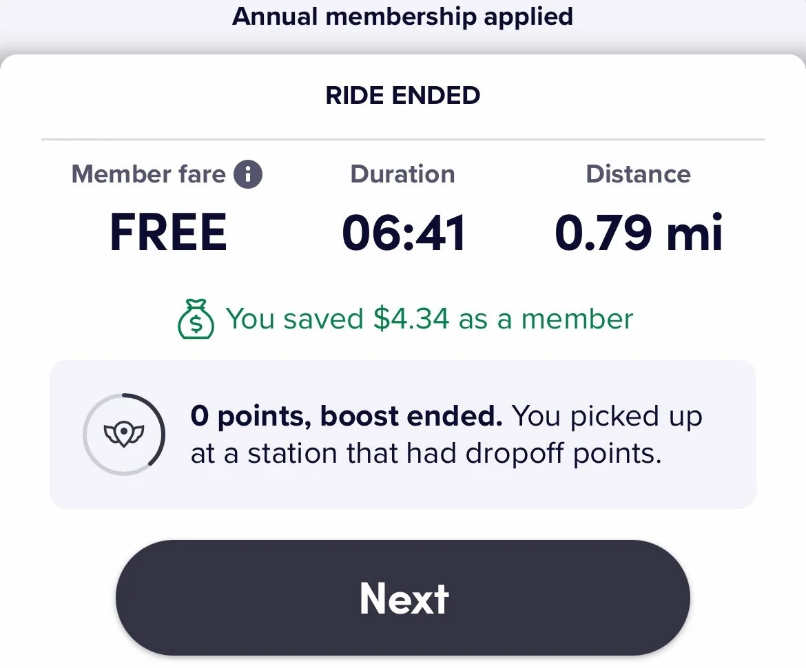Inside the app there is also a summary of your ride, with a start and end dock, a line connecting them, and a more detailed summary of the trip. This messaging has also changed and indicate to me that Citi Bike pricing is no longer set to be competitive and pushes value into the recurring revenue subscription.