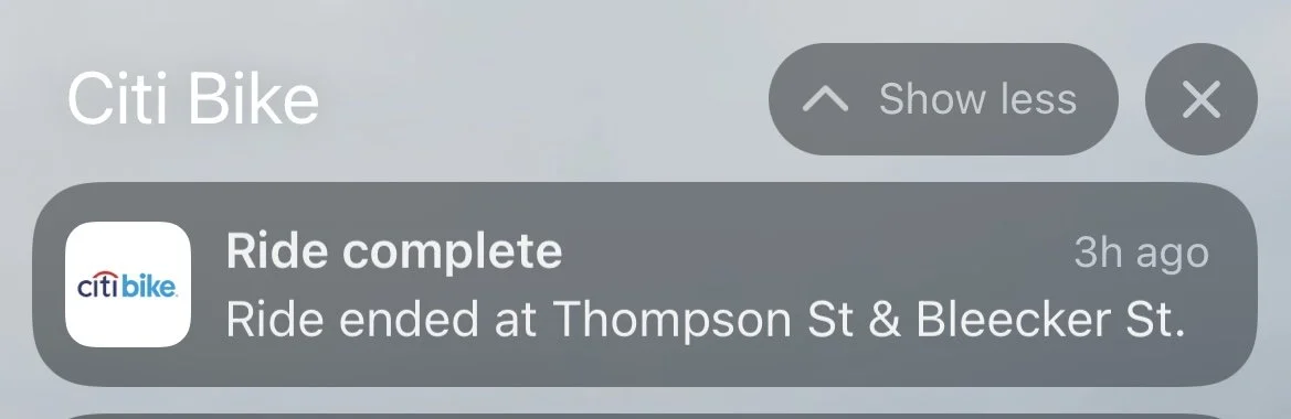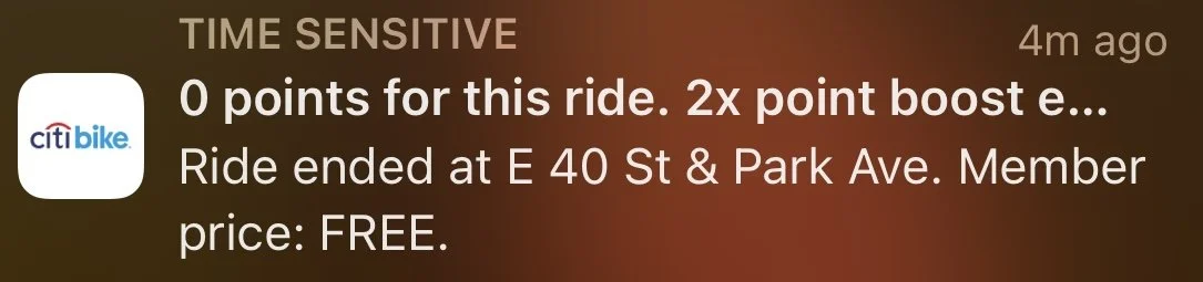 Recently Citi Bike appears to have changed its messaging and pricing. I am an annual member and previously, when I used a Citi bike for less than sixty minutes and docked the regular bicycle I would get a push notification letting me know it was docked successfully, a helpful feature with only the relevant information.